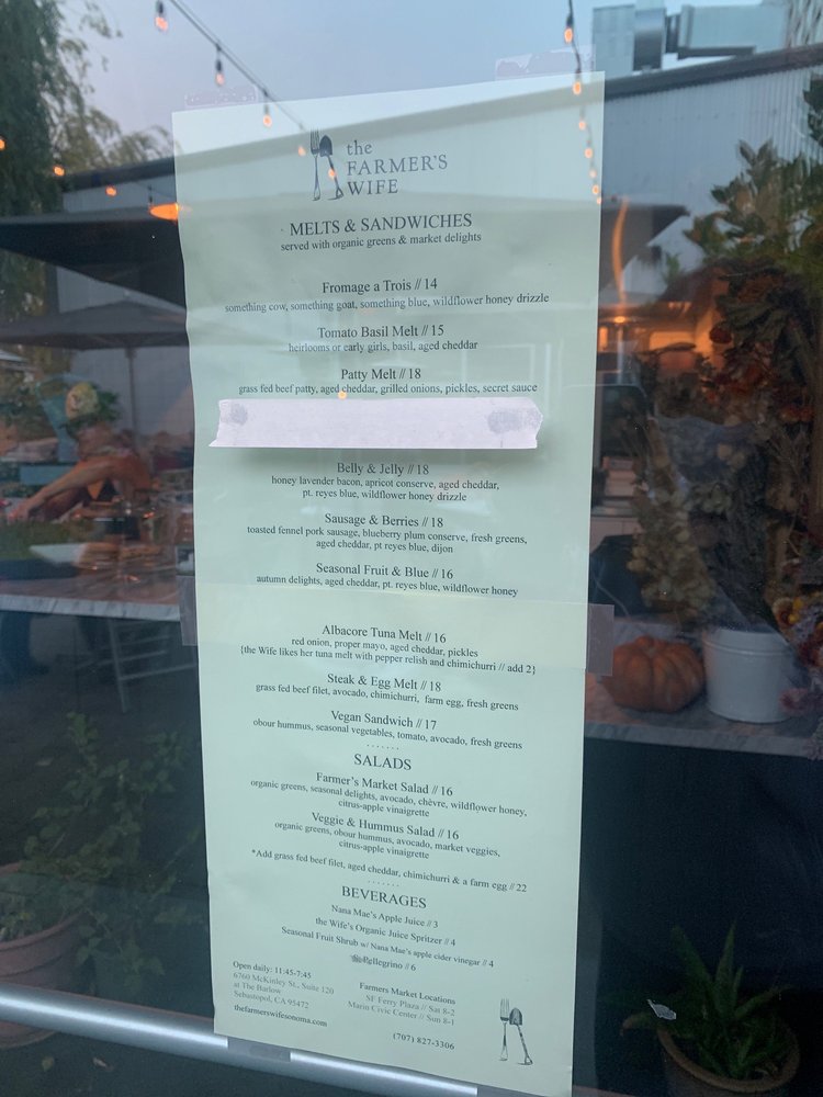 Introducing The Farmer’s Wife, a food stand in Sebastopol, CA, known for its delicious sandwiches and unique offerings. The menu boasts options like the popular Tuna Melt and Jelly and Belly sandwich, loved by customers for their flavors and quality. The Farmer’s Wife also caters to vegan and vegetarian diners with a variety of options. The salads are described as generous and high-quality, making for a satisfying meal. The freshness of the ingredients procured at the farmer's market each week adds to the appeal of the dishes. While prices may be on the higher side, customers agree that the exceptional taste and thoughtfully crafted flavors make it worth every penny. Whether you're looking for a quick takeout meal or a relaxed outdoor dining experience, The Farmer’s Wife offers a classy setting with excellent service. Visit this gem at The Barlow for a memorable culinary experience.